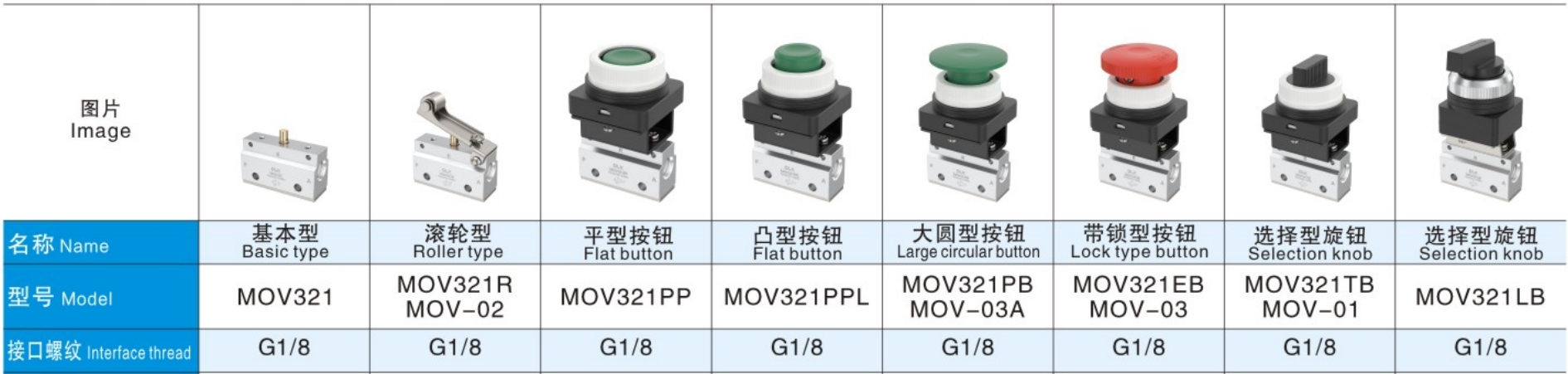 Injap siri MOV321 boleh mengawal silinder bertindak tunggal dengan diameter antara muka M5 dan G1/8. P bermaksud salur masuk, untuk outlet, dan pelabuhan ekzos terletak di rod push.