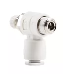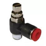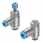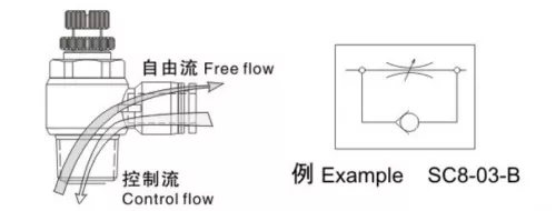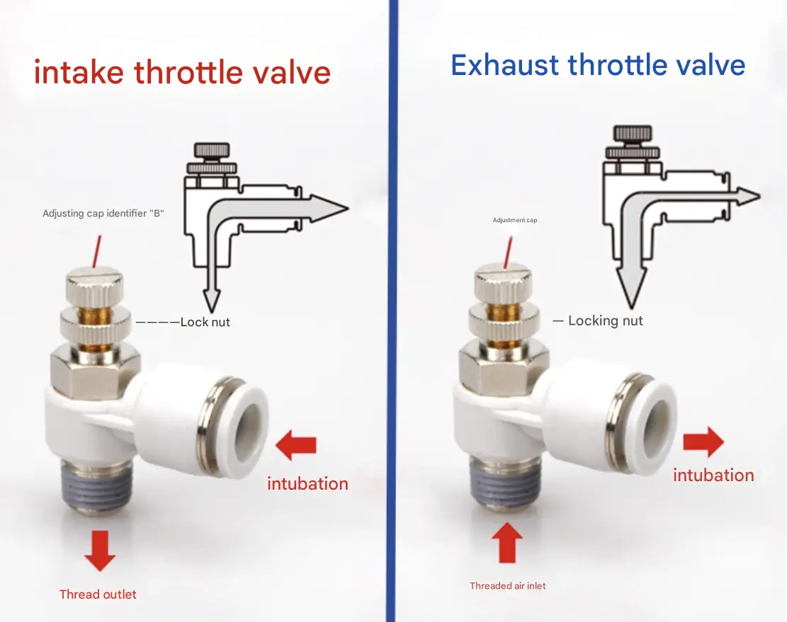 Ini adalah injap pendikit masuk dan ekzos, dibezakan oleh tanda 'B' dan 'keluar'. Mereka boleh digunakan bersama: injap pendikit masuk menyesuaikan aliran bekalan udara, manakala injap pendikit ekzos mengawal kelajuan silinder untuk kawalan sistem yang lebih tepat.