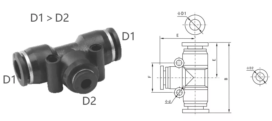 PET PE (Kesatuan tee yang sama): Ketiga tiub mempunyai diameter luar yang sama, sesuai untuk menghubungkan tiga tiub pneumatik dengan saiz yang sama.